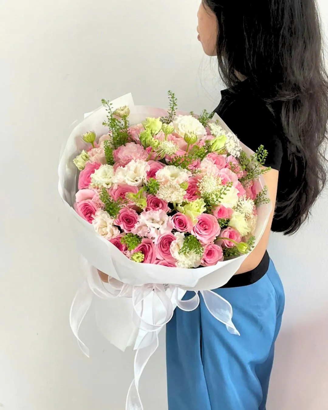 Bó hoa trong hình mang vẻ đẹp ngọt ngào và đầy đặn, là sự hòa quyện hài hòa giữa hoa hồng hồng, hoa trắng và sắc xanh tươi mát của lá, tượng trưng cho tình yêu dịu dàng, sự quan tâm chân thành và những lời chúc hạnh phúc trọn vẹn. Sắc hồng thể hiện sự yêu thương, nữ tính và ấm áp, trong khi hoa trắng mang ý nghĩa của sự thuần khiết, chân thành và bình an. Tổng thể bó hoa gửi gắm thông điệp yêu thương sâu lắng, mong người nhận luôn được trân trọng, yêu thương và sống trong niềm vui, hạnh phúc mỗi ngày.