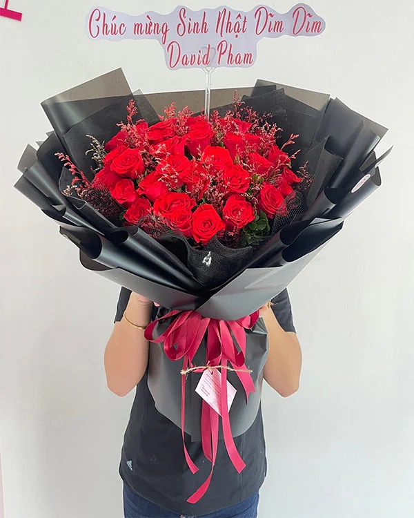 Bó hoa trong hình mang ý nghĩa mạnh mẽ và đầy cảm xúc, nổi bật với những đóa hoa hồng đỏ rực rỡ tượng trưng cho tình yêu nồng cháy, sự trân trọng sâu sắc và những cảm xúc chân thành nhất dành cho người nhận. Gam màu đỏ kết hợp cùng giấy gói đen sang trọng thể hiện sự đẳng cấp, quyết đoán và lời chúc về thành công, may mắn. Tổng thể bó hoa gửi gắm thông điệp yêu thương mãnh liệt, lời chúc sinh nhật ý nghĩa, mong người nhận luôn hạnh phúc, được yêu quý và tỏa sáng theo cách riêng của mình.