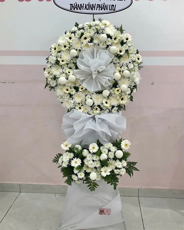 Vòng hoa chia buồn được thiết kế trang trọng với sắc trắng thuần khiết của hoa cúc và hoa bi, kết hợp cùng nơ trắng tinh giản, tượng trưng cho sự tiếc thương sâu sắc, lòng thành kính và sự tiễn biệt trang nghiêm dành cho người đã khuất; hình dáng vòng tròn khép kín thể hiện sự trọn vẹn, vĩnh hằng của kiếp nhân sinh và lời cầu nguyện cho hương linh sớm được an nghỉ nơi cõi vĩnh hằng, đồng thời gửi gắm sự cảm thông chân thành, sẻ chia nỗi đau mất mát và lời động viên nhẹ nhàng đến gia quyến, mong gia đình sớm nguôi ngoai và vững lòng vượt qua thời khắc đau buồn này.