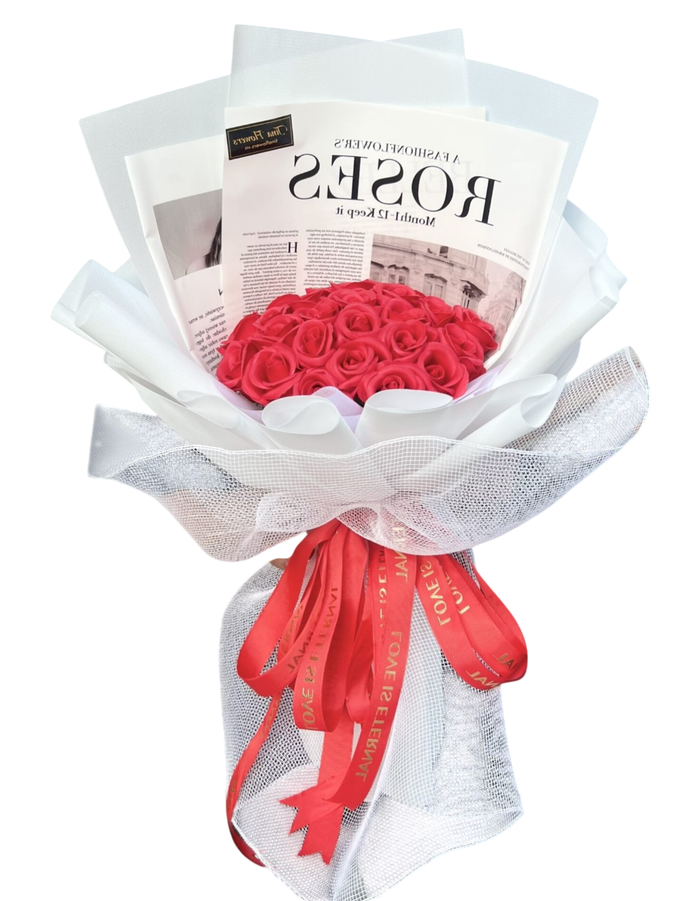Bó hoa sáp thơm đỏ 20 bông. Hoa được xếp tròn đều hoặc xếp tầng mềm mại, tạo dáng bó cân đối, đầy đặn và cuốn hút, có thể phủ nhũ kim tuyến ánh bạc hoặc ánh đỏ nhẹ giúp tổng thể thêm lung linh và sang trọng.