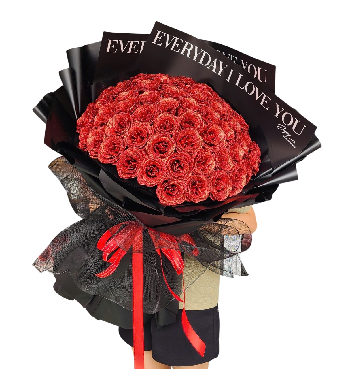 Bó hoa sáp hoa hồng đỏ trong hình mang ý nghĩa của tình yêu mãnh liệt, nồng cháy và chân thành tuyệt đối. Sắc đỏ rực rỡ tượng trưng cho cảm xúc sâu đậm, sự say mê và lời khẳng định mạnh mẽ về tình yêu không thay đổi. Hoa sáp thể hiện mong muốn gắn bó lâu dài, bền bỉ theo thời gian, như một lời hứa luôn ở bên và yêu thương mỗi ngày. Thiết kế sang trọng với tông đen – đỏ cùng thông điệp “Everyday I love you” càng làm nổi bật ý nghĩa về sự chung thủy, quyết tâm và tình cảm luôn hiện hữu trong từng khoảnh khắc. Bó hoa rất phù hợp để bày tỏ tình yêu sâu sắc, tỏ tình, kỷ niệm hoặc dành tặng người đặc biệt nhất.